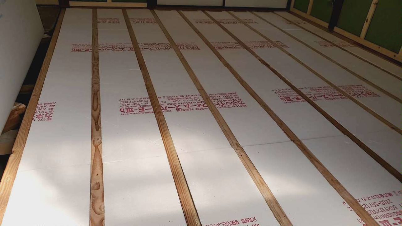 床断熱とは床(フローリング)の下に敷き詰める発泡スチロールのような素材です。