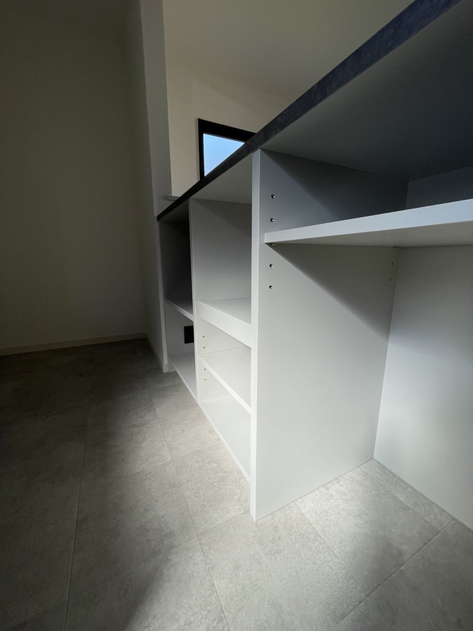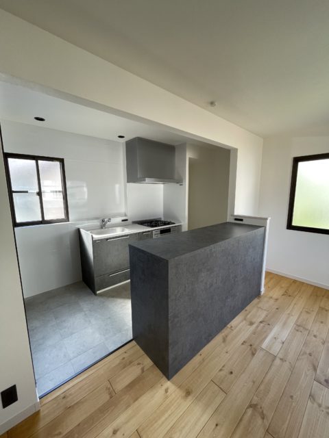 無垢とホワイトとグレーを基調とした空間にキッチンとキッチンカウンターを同じ表面材にする事で、