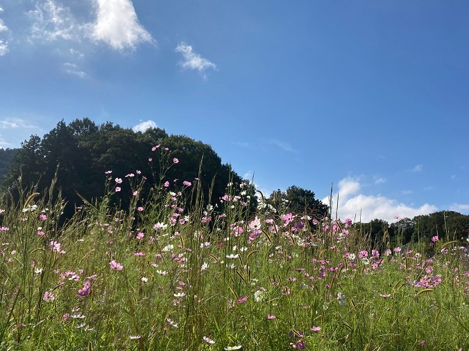 現場の近くにきれいなコスモスが咲いていました。